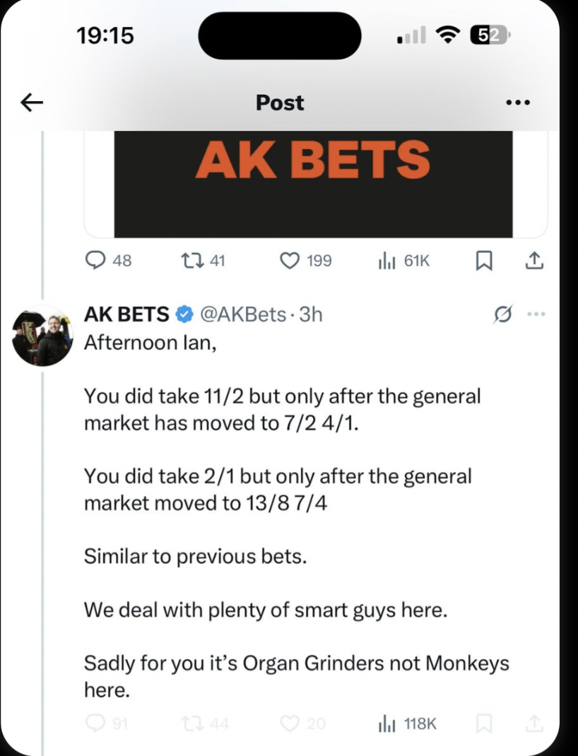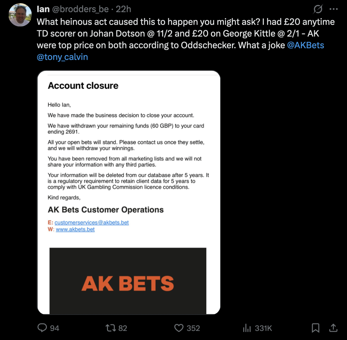 A betting dispute blew up over the weekend on X (twitter), when a punter posted an email he’d got from AK Bets online team.